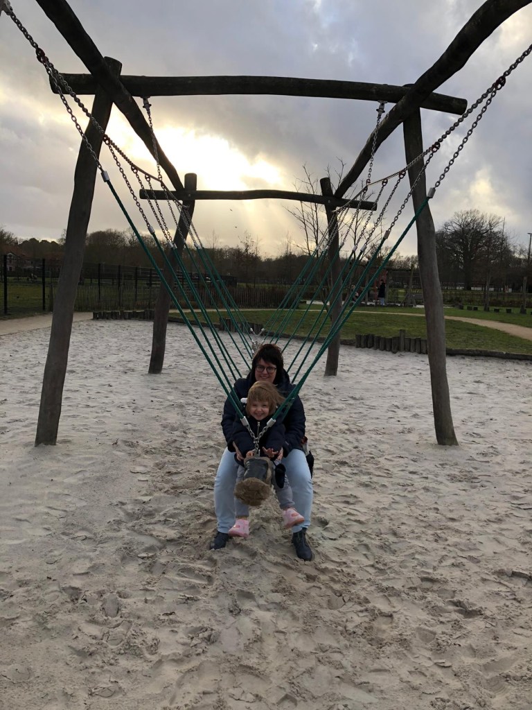 Zaterdag konden we er een leuke dag van maken. We speelden wat binnen, lunchten en vertrokken dan naar de speeltuin. We kwamen een papa met een kindje met spalkjes tegen waar we een praatje mee maakten en kwamen ook nog een ander kindje tegen in rolstoel. Het doet altijd wel eens goed om mensen te zien die in een gelijkaardige situatie zitten. Plots voel je je niet meer zo alleen, al ken je de mensen van haar noch pluim. Bizar als je er dan 2 op een namiddag tegenkomt aan een speeltuin in een park. We maakten heel veel plezier op de verschillende speeltuigen.