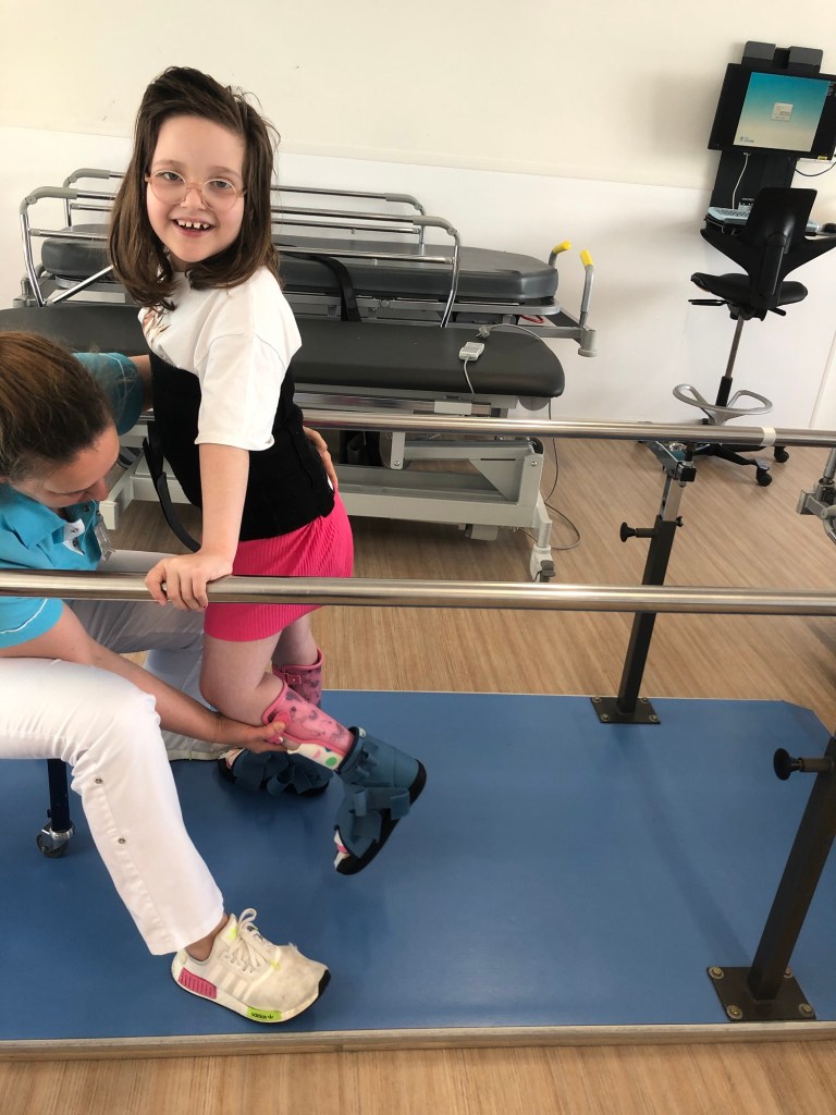 Elise zette haar eerste paar voorzichtige stapjes met de kaye walker.